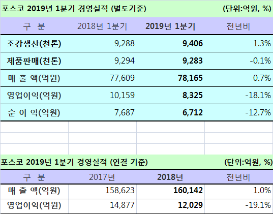 포스코의 1분기 연결기준 매출은 16조142억원, 영업이익 1조2,029억원, 순이익 7,784억원을 기록했다. 전년동기 대비 매출은 1.0% 증가했지만 영업이익과 순이익은 각각 19.1%, 28.2% 감소했다.