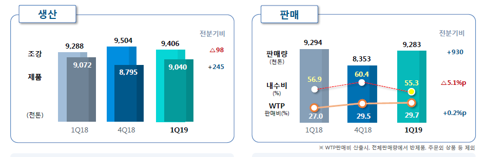 1분기는 수출 확대 등으로 내수판매 비중은 55.3% 줄었지만 월드탑프리미엄(WTP) 제품의 판매 비중은 29.7%를 보여 증가세를 유지했다.