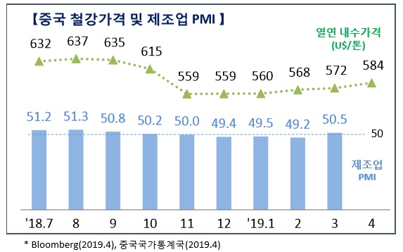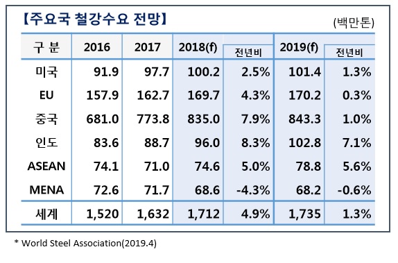 반면 올해 철강 세계 수요는 증가세가 둔화될 것으로 예상된다. 2019년 중국 수요는 미국과의 무역전쟁에도 불구하고 경기부양책 기대감으로 제로성장에서 1% 증가로 상향 조정됐다.