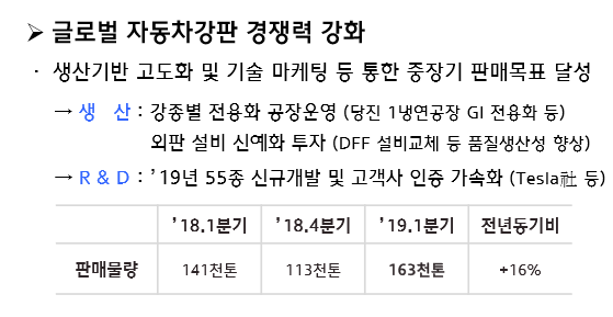 또한 회사는 55종을 신규개발 하며 고객사 인증을 가속화할 계획이다. 지난 1분기 판재 판매 물량은 16만3,000톤으로 전년 동기 14만1,000톤 대비 16% 증가했다.