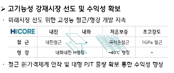 봉형강류는 고기능성 강재시장을 통해 수익성을 확보할 계획이다. 미래시장을 선도하기 위해 고성능 철근과 형강 개발을 지속할 것을 밝혔다. 철근은 새로운 가격 체계 안착에 주력할 예정이며 대형 PJT 물량 확보를 통해 수익성 확보에 나설 계획이다.