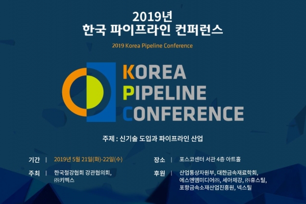 한국철강협회 강관협의회와 키멕스가 공동으로 주최하는 '2019 한국파이프라인 컨퍼런스'가 오는 5월 21일~22일 포스코센터 4층 아트홀에서 열린다.