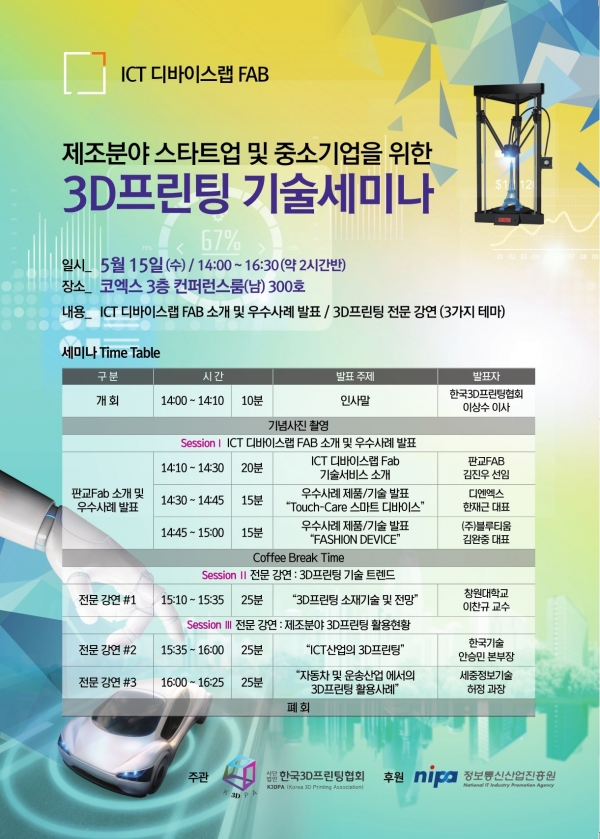 사단법인 한국3D프린팅협회(회장 최수영)는 정보통신산업진흥원(원장 김창용)의 후원으로 5월 15일 오후 2시부터 코엑스 3층 컨퍼런스룸(남) 300호에서 "제조분야 스타트업 및 중소기업을 위한 3D프린팅 기술세미나"를 개최한다.