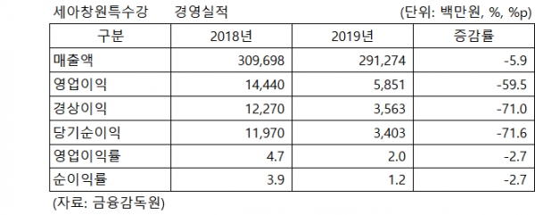 이로써 세아창원특수강의 2019년 1분기 매출액영업이익률은 2%를 기록해 2018년의 4.7% 대비 -2.7%p 감소했으며, 매출액순이익률은 1.2%를 기록해 2018년의 3.9% 대비 -2.7%p 감소했다.
