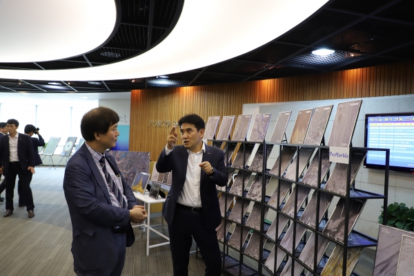 또 지난 1분기 설명회에 선보인 잉크젯 프린트 기술로 만든 대리석 무늬를 살린 포스마블 제품을 코일 형태로 만들었다고 설명했다. 기존 제품은 표면에 유리를 부착한 제품으로 시트 형태로 생산됐다. 그러나 유리 부착 시 가공에 제약이 따른다는 의견이 나와 코일 형태의 제품을 생산하고 있다. 아울러 가드레일이나 구조물 등에 사용이 가능한 후물 컬러강판 제품도 함께 선보였다.