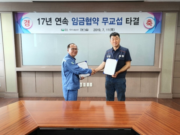 코스틸(대표 안도호)과 회사 노동조합(위원장 정삼복)이 지난 11일 올해 임금 협약을 무교섭으로 타결했다. 이는 올해 1월 최저임금법 개정에 따른 임금 체계 개선에 합의한 후 이뤄진 협약이다.