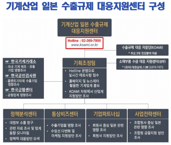 ‘기계산업 일본 수출규제 대응지원센터’(핫라인 02-369-7800)를 운영하여 정책적 대응방안 모색, 상용R&D 개발, 국내 생산기업과 수요 기업 간 매칭, 신규 해외 소재·부품 생산기업 발굴 및 금융지원 강화 등을 추진키로 했다.