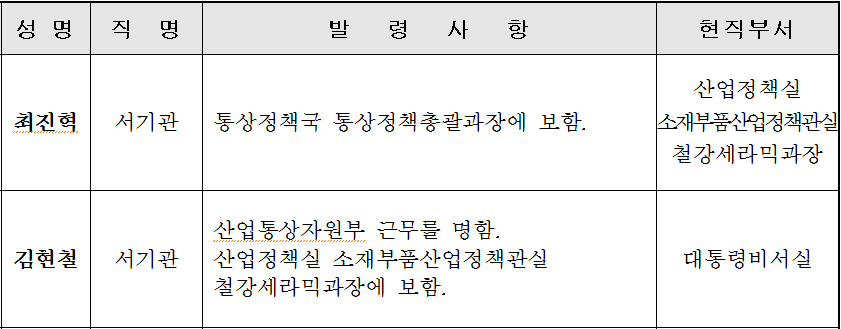 통상산업자원부는 19일부로 철강세라믹과장에 김현철 서기관(대통령비서실)을, 최진혁 서기관은 통상정책총괄 과장에 보임했다. 김도연 기자 kimdy@snmnews.com 다른 기사 보기 관련기사 산업부, 카자흐스탄과 에너지·산업 협력 추진 저작권자 © 철강금속신문 무단전재 및 재배포 금지