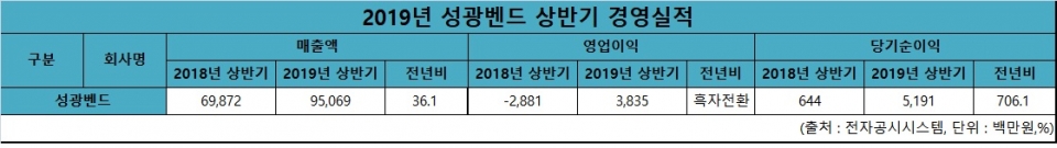 성광벤드가 금융감독원에 제출한 반기보고서에 따르면 상반기 매출액 950억6,900만원을 기록해 지난해 같은 기간 698억7,200만원 보다 36.1% 증가했다. 영업이익은 38억3,500만원을 기록해 흑자전환에 성공했다. 당기순이익은 51억9,100만원을 기록해 지난해 같은 기간 대비 706% 늘었다.