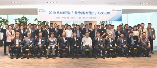 포스코건설은 최근 인천 송도사옥에서 협력사와 동반성장을 위해 포스코건설 임직원과 협력사 대표 50여 명이 참석한 가운데 `혁신성장지원단`을 출범했다.(사진-참조)