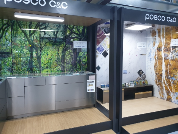 특히 이번 전시회에서 포스 스테인리스 키친을 선보이고 있다. 주방 싱크대부터 벽면, 후드 등에 모두 포스코강판의 제품이 대거 적용됐다. 싱크대 하부장은 컬러 스테인리스 스틸(STS), 주방 벽면에는 포스마블, 주방 후드에도 컬러 STS가 적용됐으며 다양한 색상과 일대일 맞춤 디자인도 가능하다. 유명 브랜드 대비 가격 경쟁력을 갖고 있어 향후 수요 확대가 기대되고 있다.