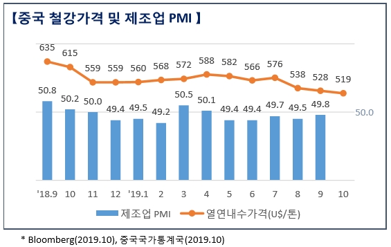특히 포스코는 중국 경제성장률이 1분기 6.4%에서 2분기 6.2%, 3분기 6.0% 수준을 기록했다며, 자동차, 기계 등 제조업 생산 활동의 부진으로 제조업 PMI도 5개월 연속 기준선을 하회한 점을 지적했다.