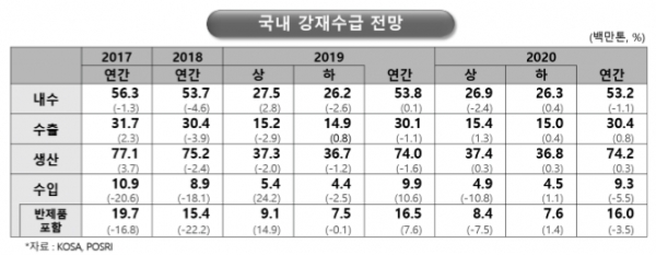 2020년 국내 철강 수급 전망은 내수와 수출이 모두 어려운 가운데 수입재 시장 잠식 리스크까지 상존하며 어려운 한 해가 될 것이라는 전망이 나왔다.