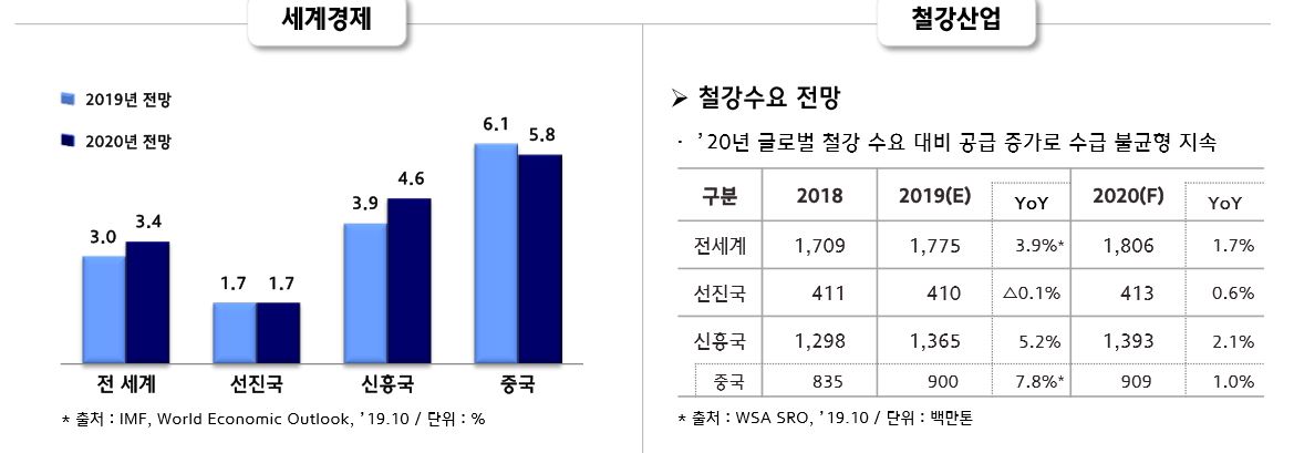 현대제철은 3분기 기업설명회(IR)에서 세계경제에 대해 미중 무역갈등 장기화에 따른 글로벌 성장 둔화가 확대될 것으로 전망했다. 철강산업의 경우 글로벌 철강 수요의 저성장세 지속에도 불구하고 중국 조강생산 확대로 수급 불안정이 심화될 것으로 내다봤다.