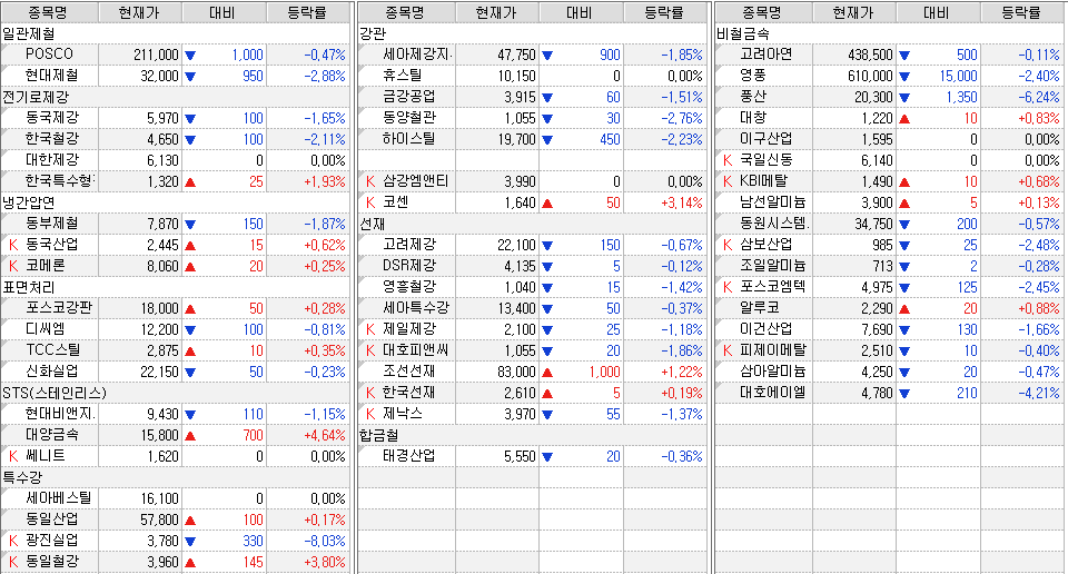 철강ㆍ비철금속 업체 주가 동향 (30일 종가 기준)