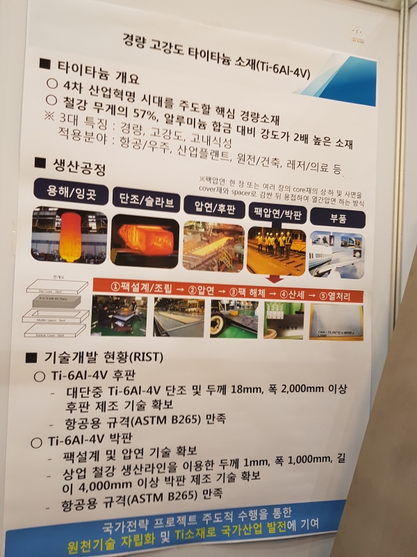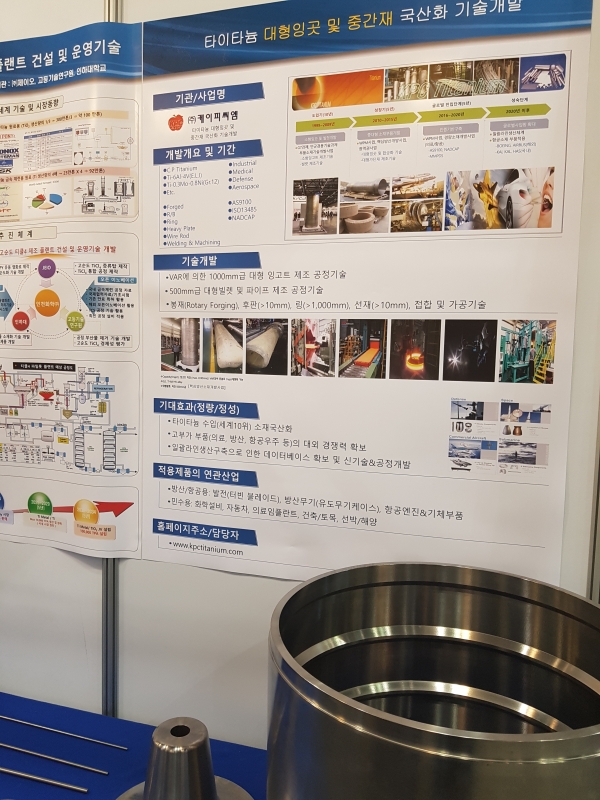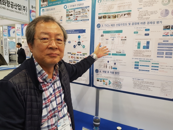 한국금속재료연구조합 부스에서 만난 손호상 경북대 신소재공학부 교수는 국내의 현재 실정은 Ti 스폰지를 중국 일본 러시아 등으로부터 구매해 와서 제련을 거쳐 타이타늄 제품을 제조하는 수준이라고 말했다.