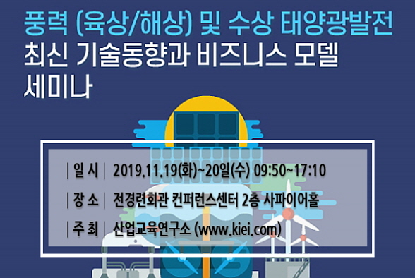 산업교육연구소는 '풍력 (육상/해상) 및 수상 태양광발전 최신 기술동향과 비즈니스 모델 세미나'를 오는 11월 19일부터 20일까지 서울 여의도 전경련회관에서 개최한다고 밝혔다.