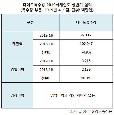 이에 따르면 다이도특수강의 상반기 매출액은 971억1,700만엔(한화 약 1조405억원)으로 전년 동기 대비 4.8% 감소했다.
