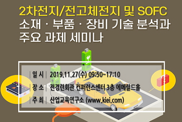 이와 같은 상황에서 산업교육연구소(https://www.kiei.com)는 오는 11월 27일에 서울 여의도 전경련회관에서 ‘2차전지/전고체전지 및 SOFC 소재·부품·장비 기술 분석과 주요 과제 세미나’를 개최한다고 밝혔다.