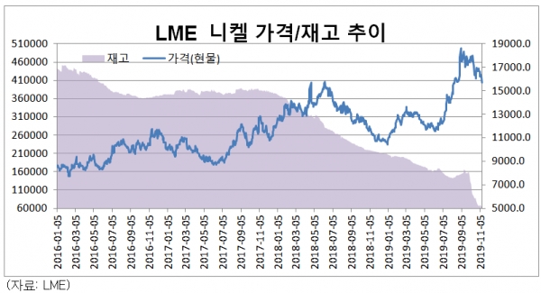 특히, 11월 들어서도 LME 니켈 가격은 톤당 1만6,000달러대에 7거래일 연속 머무는 부진을 보이고 있다. 여기에 11월 11일 LME 니켈 가격은 현물 기준 톤당 1만5,730달러로 올해 8월 27일 이후 54거래일 만에 톤당 1만5,000달러대로 떨어졌다. 이에 11일 기준 11월 평균 가격은 톤당 1만6,313.6달러로 10월 평균 가격 대비 톤당 799.9달러가 추가로 하락한 상황이다.