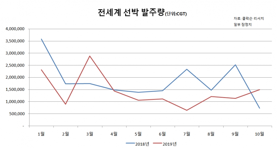 12일, 영국의 조선·해운분석기관 클락슨리서치에 따르면 10월 전세계 선박 발주량은 150만CGT(표준화물선 환산톤수/38척)를 기록했다. 이 가운데 국내 조선업계는 2만3,000TEU급 초대형 컨테이너선, 액화천연가스(LNG)선 등 고부가가치 선박 위주로 전체 발주의 86%(129만CGT, 17척)를 수주했다.
