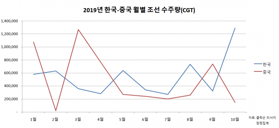국내 조선업계는 누적(1~10월) 수주에서도 중국을 추월했다. 한국의 누적 수주량은 총 695만CGT(39%)로 611만CGT(35%)를 수주한 중국을 앞질렀다. 3위는 일본(233만CGT, 13%), 4위는 이탈리아(14만CGT, 6%)다. 누계 수주액도 한국은 159억7,000만달러로 중국(136억7,000만달러)를 제치고 석 달째 1위를 기록했다.