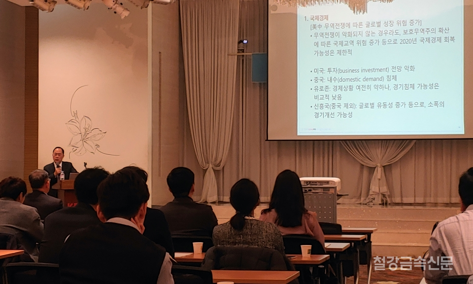 원자재 시장분석기관인 코리아PDS가 21일 오후 서울 여의도 중소기업중앙회관에서 개최한 '2020년 국제경제 및 원자재 시장전망 세미나'에서 김준원 이사는 "OECD 경기선행지수가 2017년 5월 이후 28개월 연속 하락한 것은 제조업 중심의 국내경제의 상황이 장기간 심각하게 악화되고 있다는 것을 시사한다"면서 "현재 4분기 성장률이 0.8% 정도로 추산되며 올해 전체적으로는 1.8% 성장에 그칠 것으로 본다. 무엇보다 산업경쟁력이 심각하게 악화되고 있다"고 분석했다.