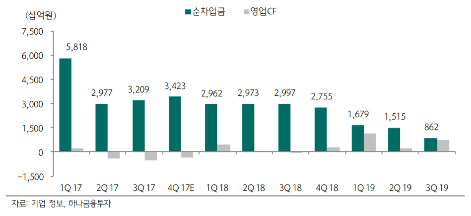 아울러 박무현 애널리스트는 대우조선해양이 안정적 선박 건조 마진을 기록하고 있다고 순차입금이 감소하는 중이라고 덧붙였다. 그는 “대우조선해양의 2019년 3분기 말 순차입금은 8,622억원으로 전분기 대비 약 6,500억원이 감소했다”며 “LNG선과 VL탱커 중심의 주력 선박의 반복 건조로 3분기 영업현금흐름이 7,659억원 수준으로 증가했기 때문”이라고 밝혔다.