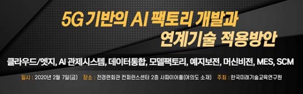 한국미래기술교육연구원(대표 박희정)은 오는 2월 7일 서울 여의도 전경련회관 사파이어홀에서 '5G 기반의 AI 팩토리 개발과 연계기술 적용방안 세미나 - 클라우드/엣지, AI 관제시스템, 데이터통합, 모델팩토리, 예지보전, 머신비전, MES, SCM '를 개최한다고 밝혔다.