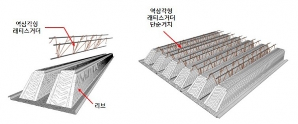 이번에 개발한 공법은 임시 받침 기둥 위에 8~9m의 더블 리브 골형 강판(단위 폭 600㎜에 두 개의 리브를 가지는 데크플레이트)을 올리는 방식이다. 이 방식이 기존의 공법들과 다른 점은 포스코 차량용 'GI-ACE' 강판을 사용해 데크의 형상 제작성을 높였다는 것이다. 또 시공 자체도 용접 없이 역삼각형 래티스거더를 리브 사이에 간편하게 설치해 공기단축성과 시공성을 확보했다.