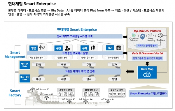 현대제철은 지난 2017년 3월부터 본격적으로 인공지능(AI)과 빅데이터를 이용해 제철소의 생산 공정 및 기술력 향상을 꾀하기 위한 스마트 팩토리 고도화를 시작했고 이와 더불어 제조 부문과 연구기술 분야 그리고 영업, 구매, 지원 등 사업 부문의 데이터 및 업무 연계하는데 주력해오고 있다.