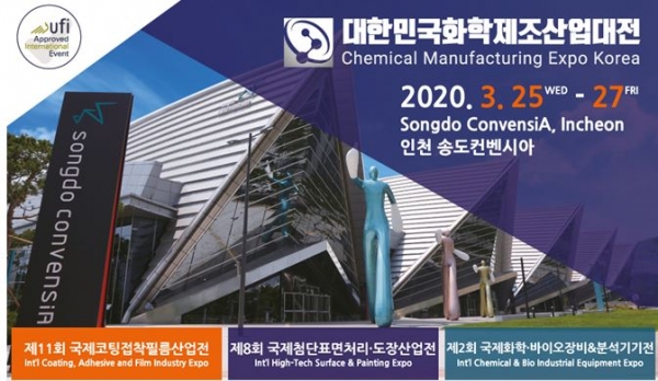 메쎄이상(대표이사 조원표)과 인천관광공사(사장 민민홍)가 공동주최하는 대한민국화학제조산업대전이 오는 3월 25일부터 27일까지 3일간 인천 송도컨벤시아에서 개최된다. ‘제11회 국제코팅접착필름산업전’, ‘제8회 국제첨단표면처리·도장산업전’, ‘제2회 국제화학·바이오장비&분석기기전’으로 구성된 ‘2020 대한민국 화학제조산업대전’은 국내외 화학 산업을 한자리에 모아볼 수 있는 국내 유일의 전시회로 2019년 국제전시산업연맹(UFI)의 국제 인증을 받으며 국제적인 공신력과 글로벌 경쟁력을 확보했다.
