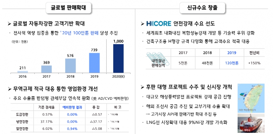 현대제철은 4분기 기업설명회(IR)에서 글로벌 자동차 강판 고객 기반을 확대하기 위해 전사적 역량 집중을 통한 ‘2020년 100만톤 판매’ 달성을 추진할 것이라 밝혔다.