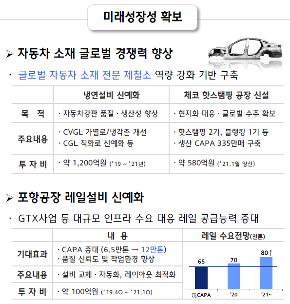 현대제철은 ‘미래성장성 확보’와 관련해 “자동차 소재 경쟁력 개선 투자 및 설비 신예화를 통해 미래 수요에 선제적 대응할 것”이라고 밝혔다. 구체적 계획으로는 ‘냉연설비 신예화’와 ‘체코 핫스탬핑 공장 신설’ 투자 계획을 공개했다.