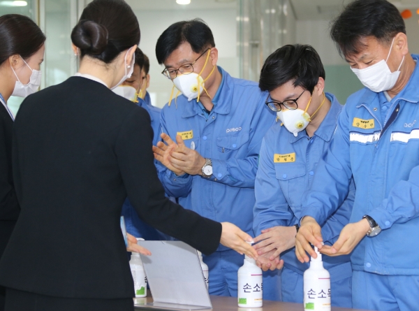 뿐만 아니라 각 공장과 부서 사무실 출입문과 공용 회의시설 등 건물 내부 곳곳에 손세정제를 두고 예방 안내문을 부착했다.