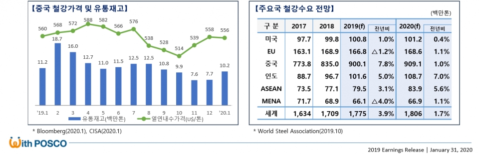 아울러 올해 철강수요는 경제 저성장, 무역 분쟁을 이유로 세계 수요 증가세가 둔화될 전망이다. 2020년 중국 수요는 제조업 부진, 대규모 경기부양 한계 등으로 전년 대비 1.0% 내외 증가해 9억톤 수준을 유지할 것으로 예상된다. 선진국 수요는 미국·유럽 등의 경제 저성장 및 산업생산 둔화로 0.6% 증가에 그칠 전망이다.