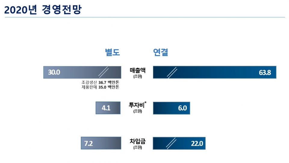 다만 투자 집행은  EBITDA 내에서 철강부문 경쟁력 향상을 위한 환경, 안전, 설비에 우선 투자하고 생산 비관련 투자는 철저한 검증 후 선별적으로 실시한다는 방침이다. 2019년 연결기준 투자는 계획 대비 50% 인 3조원을 집행할 것이라고 전했다.