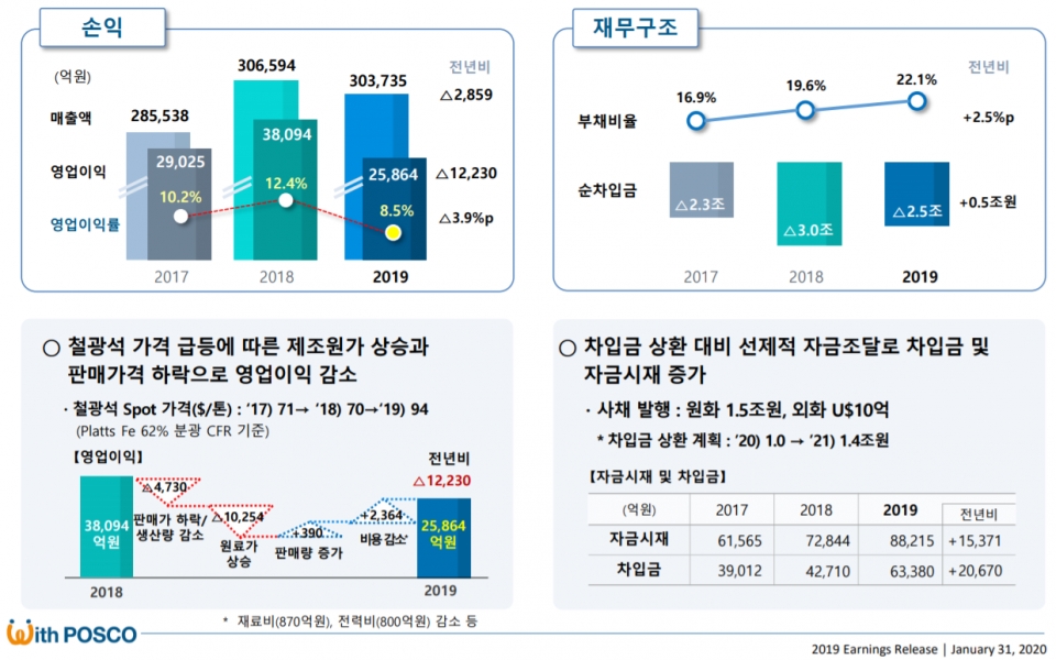 아울러 포스코는 별도기준 2019년 회사 부채비율이 22.1%로 전년보다 2.5%P 증가했다고 밝혔다. 순차입금은 전년 -3조원에서 2019년 -2조5천억원으로 감소했다고 밝혔다.
