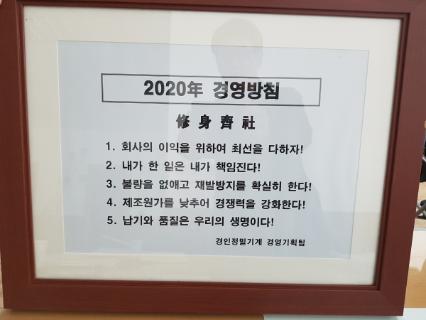 2020년 회사 경영방침으로 회사의 이익을 위해 최선을 다한다는 의미로 수신제사(修身齊社)로 정하고 있다. 내가 한 일은 내가 책임진다는 책임경영, 기술도 살아 있는 생물이라며 불량률을 없애고 재발방지를 확실히 한다는 품질우위 경영, 납기는 기본이며 오래됐다고 자만에 빠지면 뒤쳐진다며 가격보다는 품질우선 경영, 제조원가를 낮춰 경쟁력을 끌어 올리는데 주력해 나갈 것임을 밝혔다.