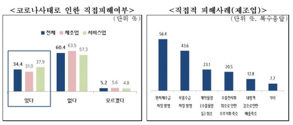 세부적으로 제조업은 31.0%, 서비스업은 37.9%의 기업이 피해를 입었으며, 피해기업 중 제조업은 ‘원자재수급 차질(56.4%)’, ‘부품수급 차질(43.6%)’ 등을 겪었고, 서비스업은 76.6%의 기업에서 ‘내방객 감소로 인한 매출 축소’를 경험한 것으로 파악되었다.