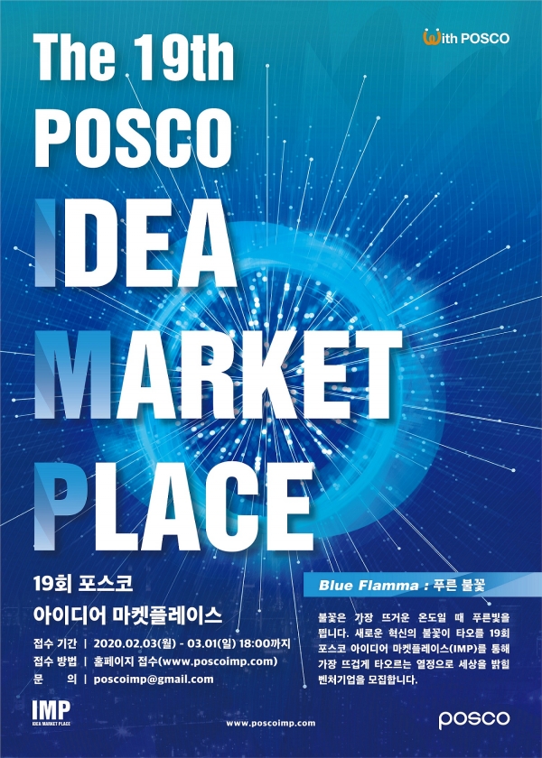 포스코가 3월 1일까지 '제 19회 포스코 아이디어 마켓플레이스'에 참여할 벤처기업을 모집하며 미래 성장 동력 확보와 국내 벤처 생태계 조성에 나섰다.