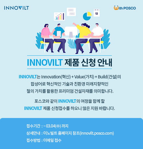 포스코(회장 최정우)가 오는 3월 4일까지 프리미엄 강건재 통합 브랜드 '이노빌트(INNOVILT)' 를 사용할 수 있는 고객사를 모집하고 지원에 나선다.
