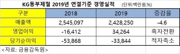 KG동부제철(대표 이세철)의 2019년 연결기준 영업이익이 흑자전환에 성공했다.