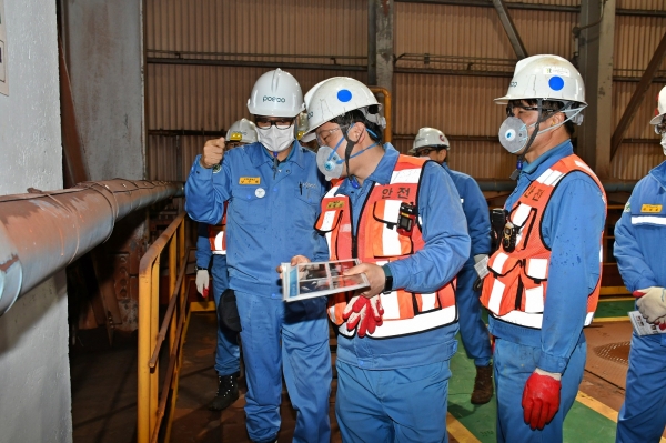 남수희 포항제철소장이 지난 25일 직원들과 함께 QSS대상을 수상한 소결공장 현장을 확인하고 있다.