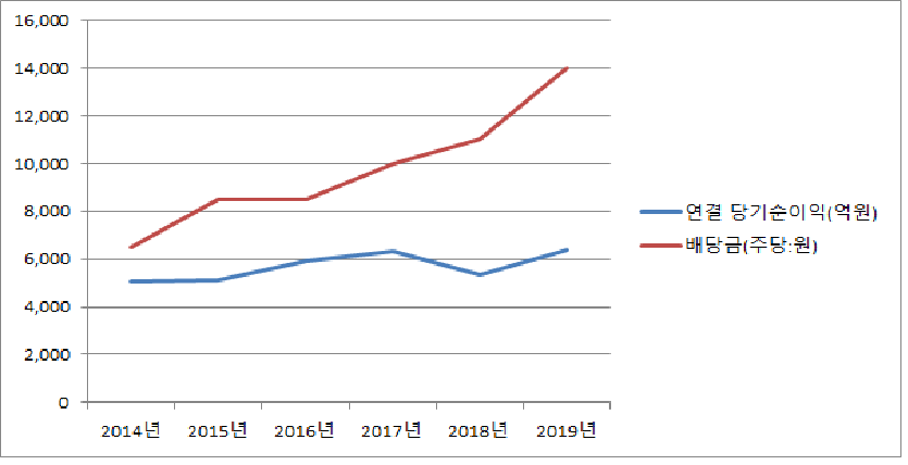 약 38.7% 현금배당성향으로 기록적인 수치를 나타냈으며 배당 확대와 대규모 투자를 통해 유보금 증대 비판에서도 벗어나는 모습을 보였다.