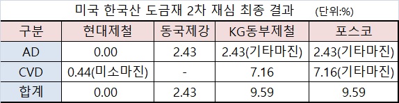 업계에 따르면 미국 정부는 11일 (현지시간) 미국으로 수출하는 한국산 도금재 2차 재심 최종 판정에서 0.00~2.43% 관세를 산정했다. 현대제철은 반덤핑관세 0%, 상계관세 0.44%(미소마진)로 최종 합계 0% 판정을 받았다. 동국제강은 반덤핑관세 2.43%, 나머지 기업들은 반덤핑관세 2.43%, 상계관세 7.16%로 합계 9.59%를 받았다.