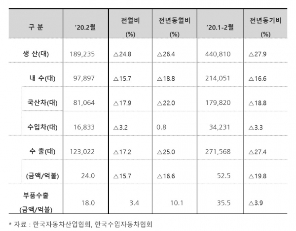 2월 자동차 생산은 지난해 같은 달보다 26.4% 감소한 18만9,235대를 기록했다. 지난달 코로나19 여파가 본격화되면서 중국산 부품 재고가 부족해지면서 공장가동이 중단되면서 생산이 크게 감소했다.