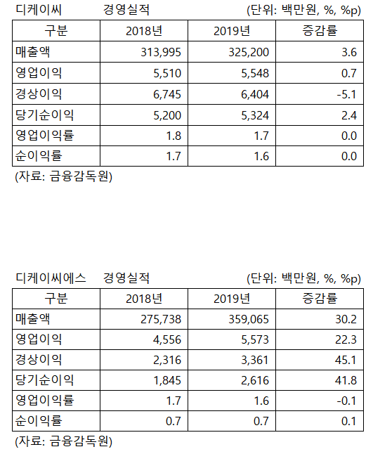 디케이씨(DKC, 대표이사 서수민)와 디케이씨에스(DKCS, 대표이사 서수민)의 2019년 매출액과 영업이익이 동반 증가세를 기록했다.