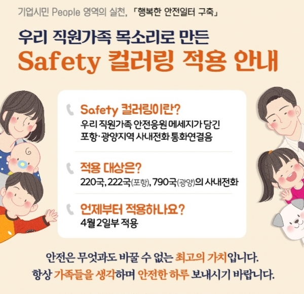 이후 제작한 통화 연결음을 지난 2일부터 포항과 광양 지역 내선번호에 적용해 일상에서 임직원이 스스로 안전 중요성을 자각할 수 있도록 유도했다. 또한 다양한 가족들의 안전 응원 메시지가 고루 전달될 수 있도록 통화 연결음을 주기적으로 교체할 계획이다.