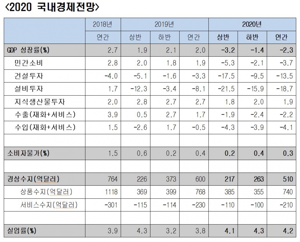 전경련 산하의 한국경제연구원(한경연·KERI)은 8일 발표한 'KERI 경제동향과 전망' 보고서를 통해 올해 경제성장률이 -2.3%를 기록할 것으로 내다봤다. 코로나19 충격으로 극심한 경기침체로 인해 IMF 외환위기 이후 가장 심각한 경제위기를 겪을 것이란 전망이다.